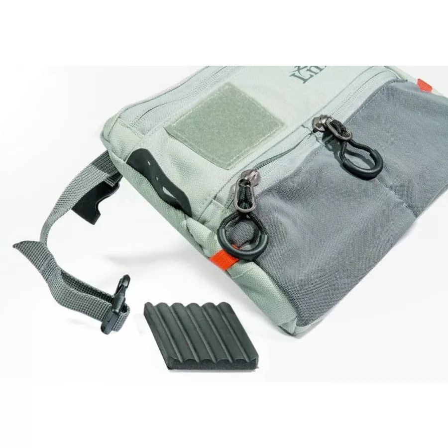 Petit sac, qui peut être attaché à la sangle de la salopette ou porté à la ceinture du pantalon. Un coussinet en mousse pour hameçons et mouches se trouve à l'avant du sac. Il dispose d'une grande poche centrale zippée, de deux poches plus petites à l'avant et d'une autre poche zippée à l'arrière. Les fermetures éclair du sac sont faciles à manipuler d'une seule main. Doté du logo Loomis and Franklin.