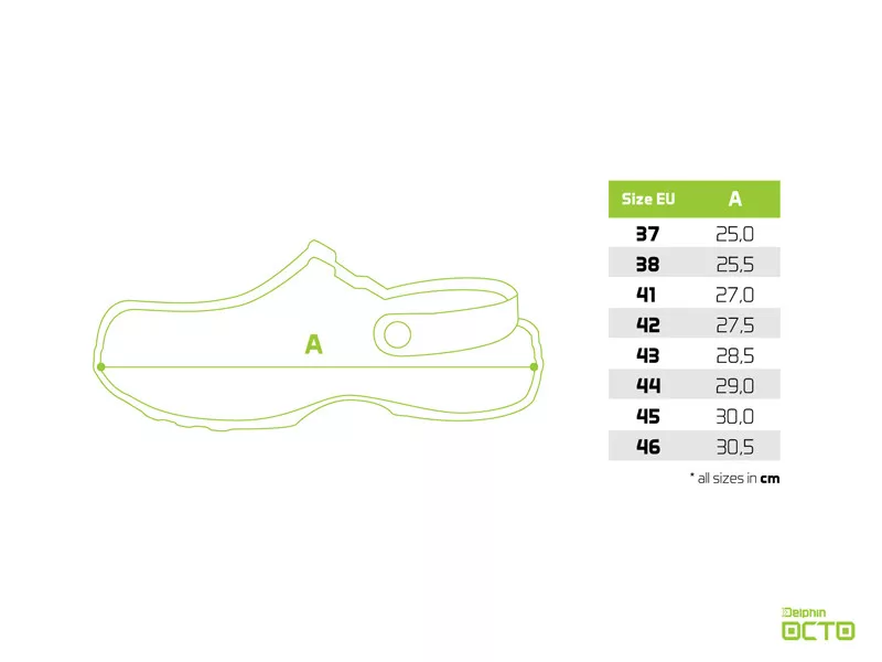 L'histoire de l'origine du nom OCTO est extrêmement intéressante. Nous l'avons conçu avec la forme stylisée des tentacules de poulpe, qui offrent une excellente adhérence dans toutes les conditions. Le poulpe est OCTOpus en anglais et OCTOpoda en latin, ces deux mots ont inspiré le design et le nom, que nous avons abrégé en OCTO. Un autre détail raffiné est la présence de grandes ouvertures latérales, qui servent principalement à la ventilation. Elles ne sont délibérément pas situées au niveau de la semelle, comme c'est généralement le cas, mais un peu plus haut. C'est important car cela aide à empêcher le sable ou les cailloux de pénétrer facilement entre la sandale et la semelle, surtout lorsque vous êtes sur la plage ou dans des eaux peu profondes. Ainsi, vous pouvez sentir vos pieds protégés au maximum. De plus, la perforation dense située dans la partie inférieure contribue également à la ventilation. D'un côté, nous avons utilisé le symbole de la lettre D du logo Delphin, et de l'autre, la lettre O, qui est la première lettre du nom OCTO. La texture fine sur la surface de la semelle, qui évoque la peau de calmar, renforce encore l'impression générale. Grâce au matériau EVA, les sandales sont extrêmement légères, durables et flottantes. Bien sûr, le modèle est également livré avec une sangle de talon qui aide à fixer le pied, surtout lors d'une utilisation sur un terrain inégal ou en pente.