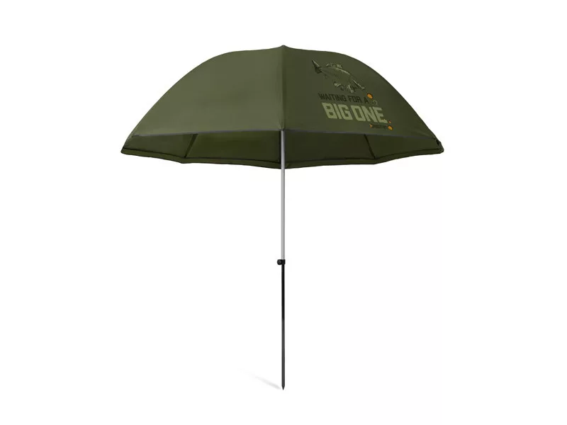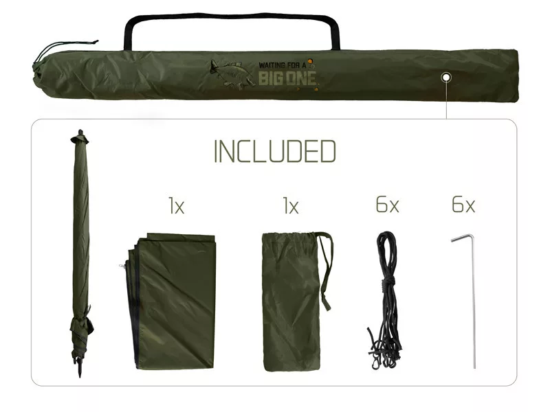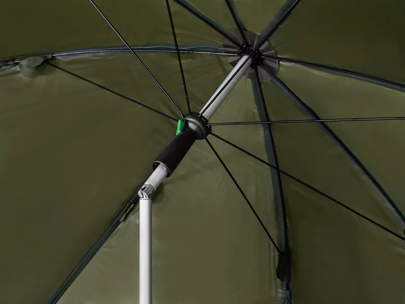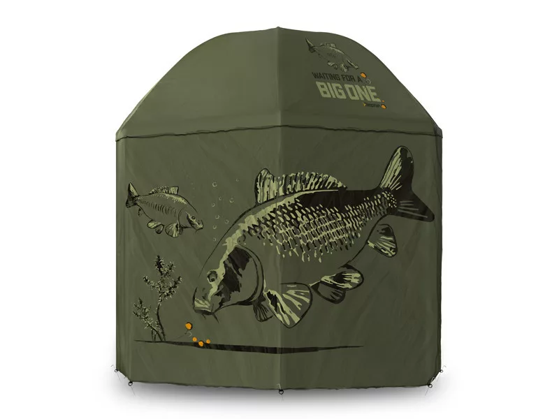 Le dôme et les côtés du parapluie sont décorés d'un graphisme de carpe distinctif, ce qui le rend parfait pour les pêcheurs de carpes. Le dôme d'un diamètre de 250 cm offre suffisamment d'espace pour deux pêcheurs et une petite table. La perche télescopique permet d'ajuster la hauteur du parapluie, ce qui le rend adapté aux pêcheurs de toutes tailles.La pointe située dans la base facilite la fixation du parapluie au sol.