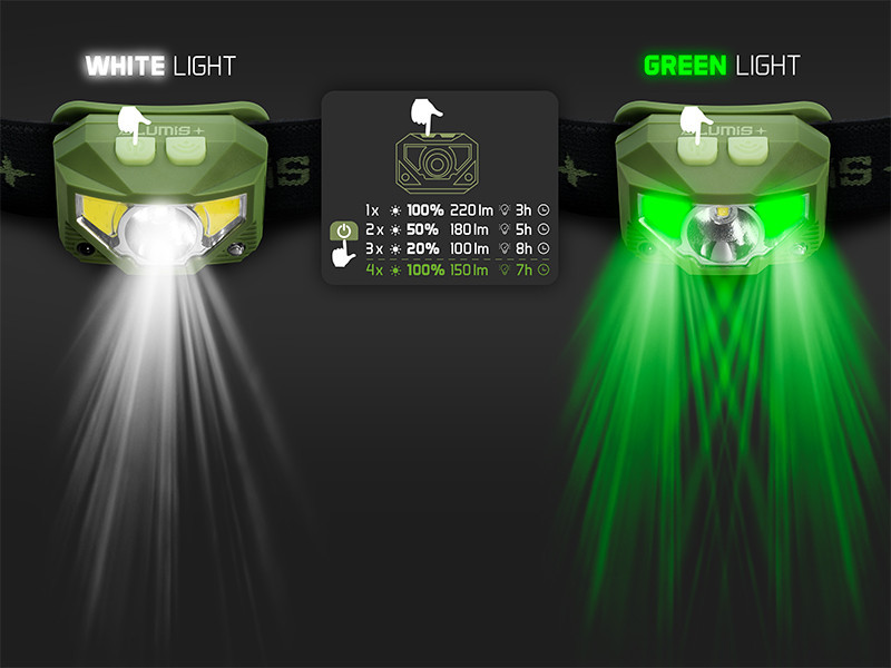 La puissance de 3 watts et la luminosité de 220 lumens de la lampe frontale fournissent un éclairage suffisant même dans l'obscurité totale. Les deux LED différentes (blanche et verte) vous permettent d'adapter la source lumineuse à l'environnement et à la situation. La lumière blanche est réglable sur trois niveaux – 100 %, 50 % et 20 % – ce qui permet de choisir la luminosité optimale en fonction de la situation. Le mode lumière verte est particulièrement utile pour les pêcheurs, car il ne dérange pas les poissons et n'attire pas les insectes, permettant ainsi de passer des nuits d'été paisibles au bord de l'eau.