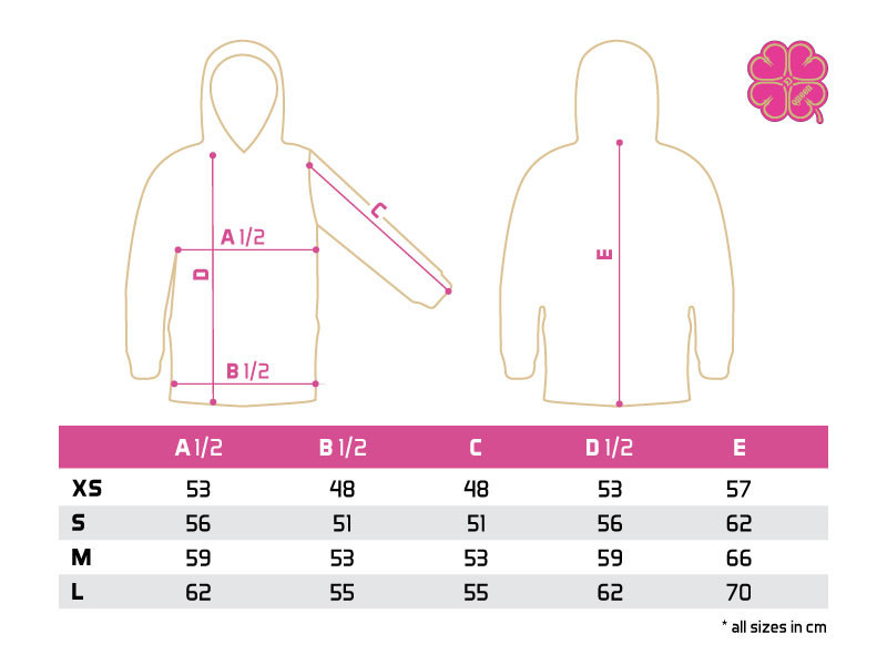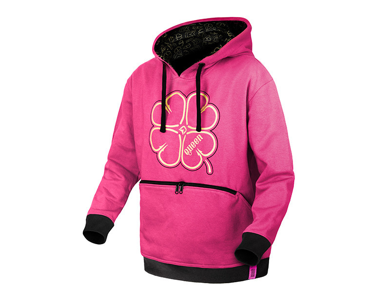 Le devant du sweat est doté d'une grande poche refermable avec une fermeture éclair double de qualité. Les poches latérales garderont vos mains au chaud par temps froid. La capuche est rose à l'extérieur, noire à l'intérieur, ornée d'un logo Delphin et d'un trèfle à quatre feuilles jaune. De plus, elle possède un cordon de serrage noir. Le sweat à capuche a une taille et des poignets élastiques ajustés.