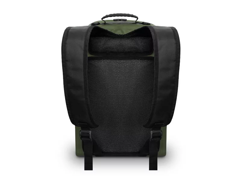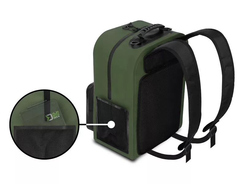 Les bretelles réglables et le dos rembourré assurent un transport confortable. Pour une manipulation aisée, une poignée caoutchoutée est également présente sur le dessus du sac, ainsi que deux boucles en plastique sur les côtés, auxquelles un mousqueton peut être attaché – par exemple, pour transporter une épuisette.