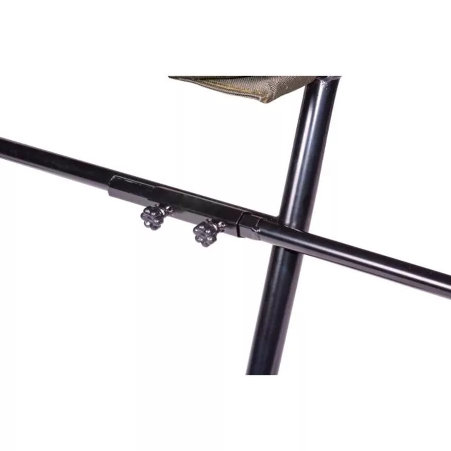 Le cadre de la chaise est fabriqué en alliage métallique robuste et durable, qui résiste parfaitement à l'humidité et à une utilisation intensive. Les quatre pieds télescopiques maintiennent la chaise stable sur tout type de terrain, même sur un sol meuble ou boueux. Le diamètre des pieds de 25 mm permet de fixer facilement divers supports de canne et accessoires, de sorte que tous vos outils importants soient à portée de main – organisés et efficaces.