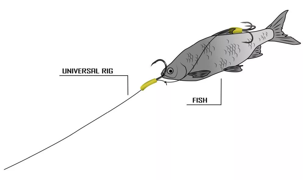 Bas de ligne spécial silure Waller de Stefan Seuß. L'Universal Rig est une solution parfaite pour la présentation de poissons-appâts et d'appâts naturels pour la pêche à la bouée, au flotteur et au fond. Le bas de ligne se compose d'un hameçon simple et d'un hameçon triple, et peut être utilisé rapidement et facilement.