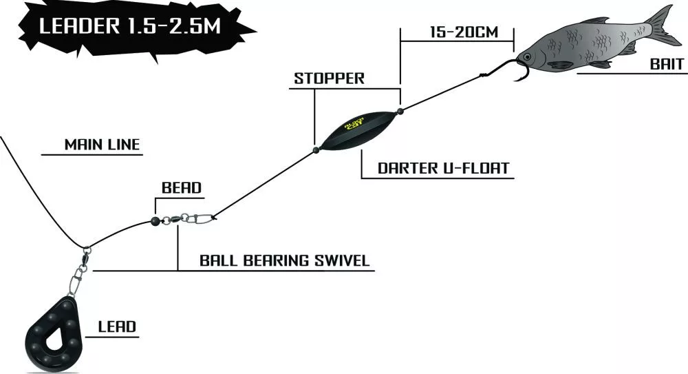 Stefan Seuß a spécialement développé le Darter U-Float pour les eaux intensément pêchées, ainsi que pour les situations où les silures réagissent timidement aux corps flottants créant un courant plus important. Le Darter U-Float a été conçu pour ressembler à la pointe d'une flèche, avec un axe mince et 4 ailes convexes (saillantes vers l'extérieur), il brise la pression de l'eau dans le courant fort et la dirige vers le corps flottant. Les ailes se comportent presque comme une quille et font vaciller l'appât dans le courant.