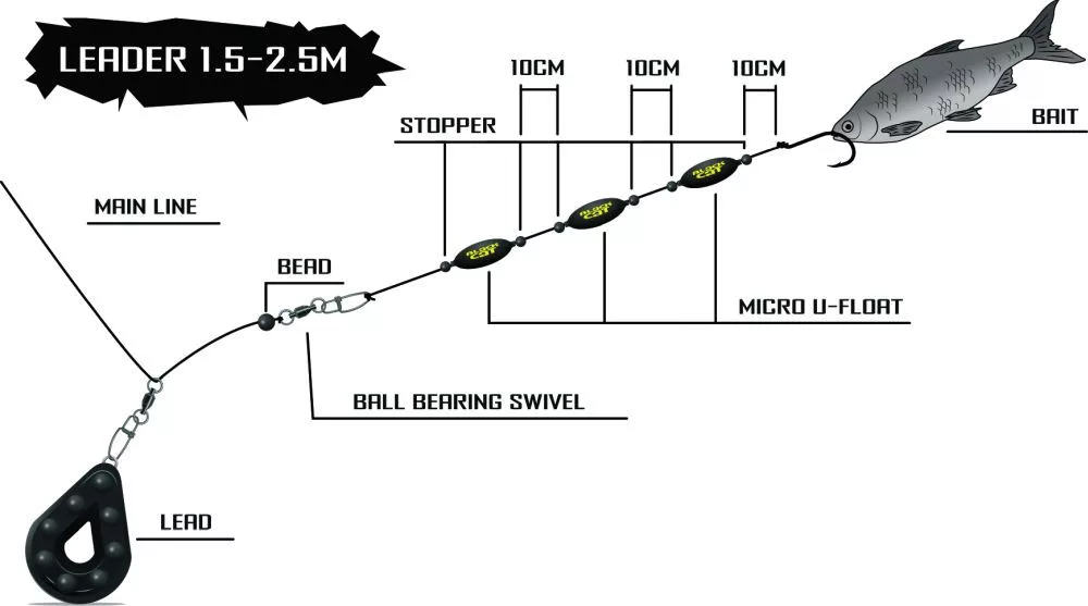 Avec les Micro U-Floats, l'appât est présenté près du fond ; selon son poids, plusieurs Micro U-Floats peuvent être fixés sur le bas de ligne, augmentant ainsi la flottabilité sans créer de courants inutiles. Selon la recommandation de Stefan Seuß, l'utilisation des Micro U-Floats est très avantageuse parmi les pierres à bords tranchants des éboulis, afin de faire flotter l'appât sans poids au-dessus des pierres. Les couleurs jaune néon et rouge néon éclatantes sont utilisées en eau claire, ce qui attire optiquement l'attention des silures.