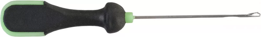 Nous utilisons cette aiguille à enfiler de taille normale lorsque nous voulons enfiler l'appât non pas sur l'hameçon, mais sur un bas de ligne cheveu, nous faisons alors passer l'aiguille à travers l'appât, puis nous accrochons la boucle du bas de ligne cheveu à l'extrémité crochetée de l'aiguille, après quoi nous faisons glisser l'appât sous l'hameçon, puis nous le bloquons avec un stopper et le bas de ligne est prêt et correctement présenté pour les poissons.