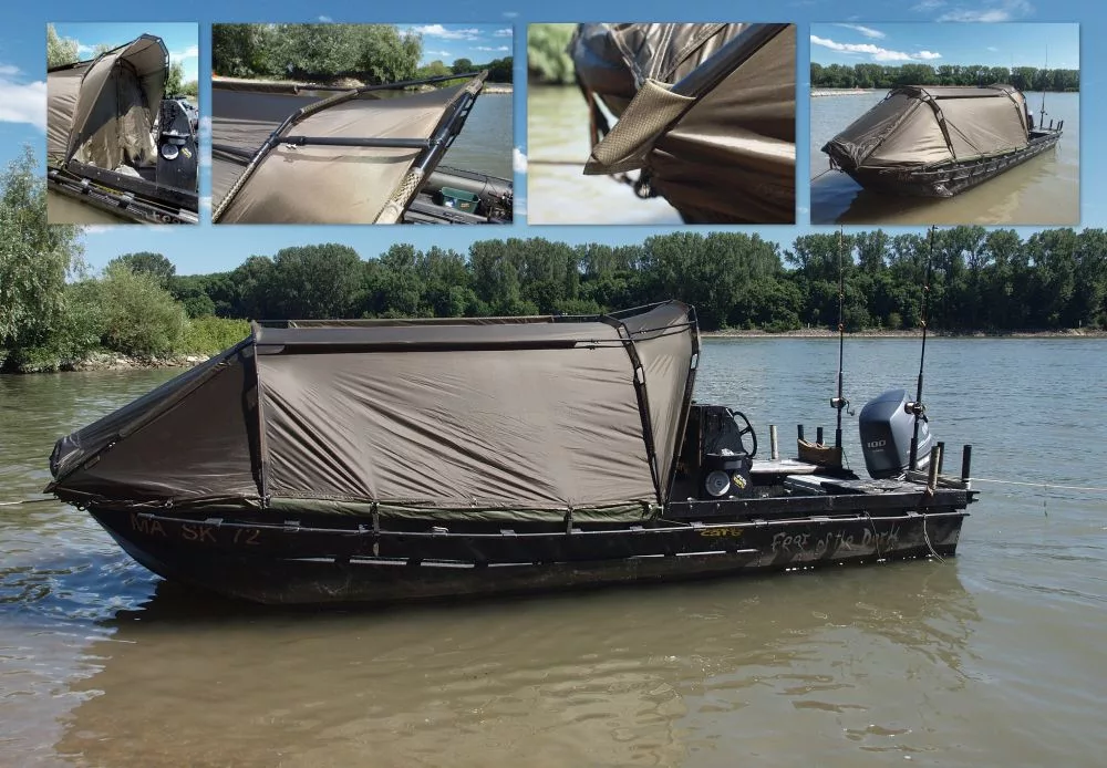La porte d'entrée centrale, s'étendant jusqu'au fond du bateau, protège l'intérieur du Boat Cave même par vent fort. Des poches velcro situées à l'intérieur permettent de placer des poids en plomb pour éviter que la porte ne batte par temps venteux. Une grande fenêtre transparente offre une bonne vue sur les cannes.