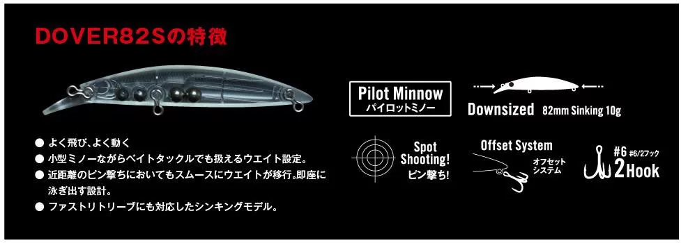L'Apia Dover 82S est un leurre coulant méticuleusement conçu, de 8,2 cm de long et 10 grammes de poids, idéal pour la pêche aux prédateurs de taille moyenne à grande. Grâce à sa caractéristique de plongée coulante (S), il peut facilement atteindre les poissons qui se tiennent plus profondément et peut être animé efficacement dans n'importe quelle couche de la colonne d'eau. Grâce à une répartition précise du poids, il vole et coule de manière extrêmement stable, permettant des lancers précis même par vent fort.