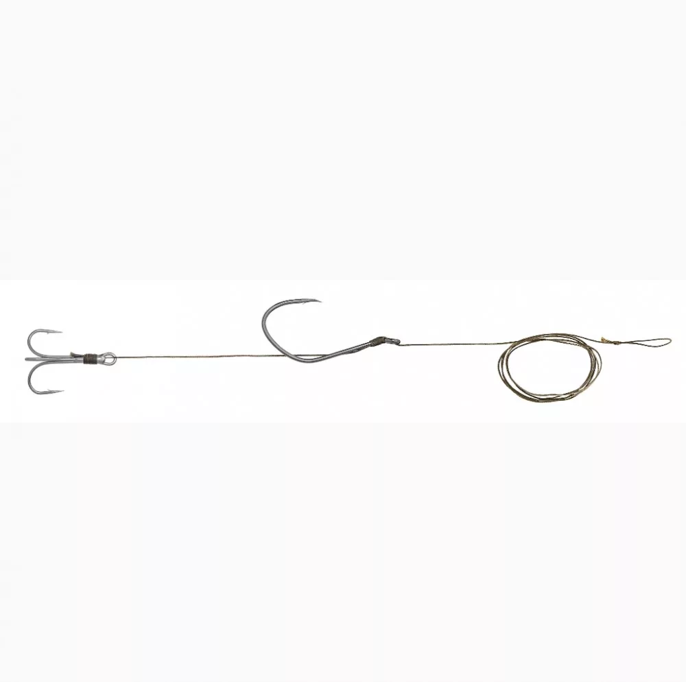 Bas de ligne conçu pour les méthodes de pêche au silure à antenne géante, au flotteur, au stupek et autres méthodes de pêche au silure, sur lequel un hameçon simple et un hameçon triple de qualité et de haute résistance ont été montés, chacun étant extra-pointu et durable, assurant ainsi un bon ferrage même dans la gueule dure du silure. Les hameçons ont été montés sur une tresse de 130 centimètres de haute résistance. Nous le recommandons aux pêcheurs qui traquent les silures de grande taille et qui ne veulent manquer aucune touche, le hameçon triple suspendu sous le ventre du poisson-appât aidant dans ce dernier cas.