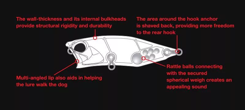 Les chambres sonores du Realis Popper 64 sont plus avancées que celles des autres poppers JDM. Il est capable de générer du son uniformément et à partir de plusieurs directions, contrairement à de nombreux leurres de surface qui ne peuvent maximiser l'acoustique que dans une seule direction.