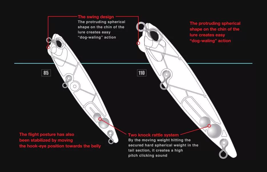Il a été enrichi d'un mouvement « dog-walking » plus étroit, qui permet non seulement d'explorer de vastes zones, mais aussi d'être efficace dans les eaux sous pression. Héritant du mouvement latéral du modèle 110, le Pencil 85 aide à une capture réussie avec une action plus serrée.