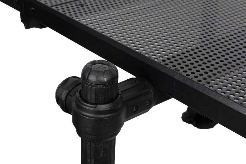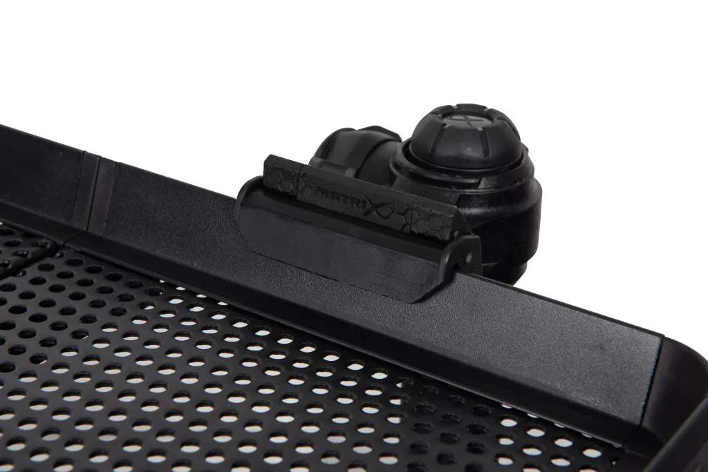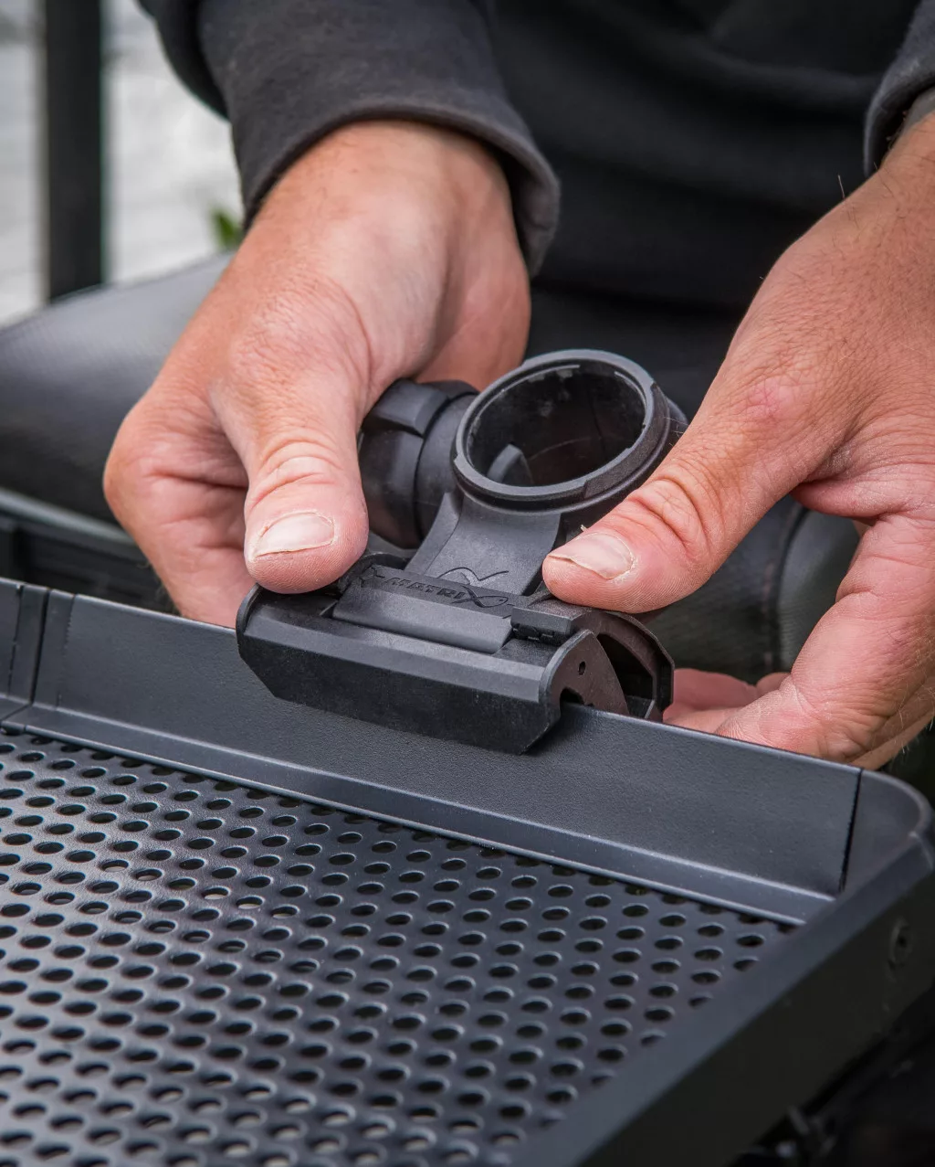 L'adaptateur est conçu pour être clipsé sur le rebord extérieur extra robuste des plateaux latéraux Matrix. La fixation peut être réalisée dans n'importe quelle position autour du rebord, permettant au pêcheur d'ajuster le placement selon ses propres besoins. Ceci est particulièrement utile si l'on souhaite ajouter un pied de support au plateau, car l'adaptateur est parfaitement adapté pour une fixation stable de celui-ci.