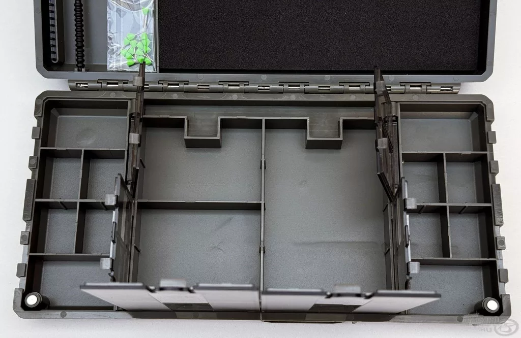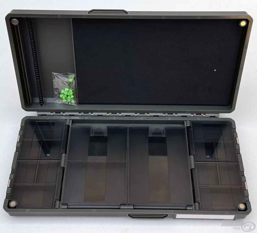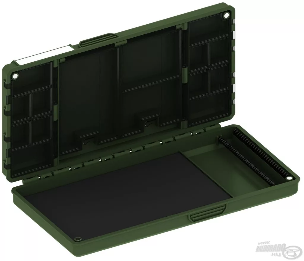 – L'un des côtés contient 15 compartiments individuels pour petits articles, à couvercle transparent, idéaux par exemple pour le rangement de caoutchoucs, émerillons, butées ou attaches d'appâts. Les compartiments s'ouvrent individuellement, vous permettant d'accéder rapidement et précisément à l'outil recherché.