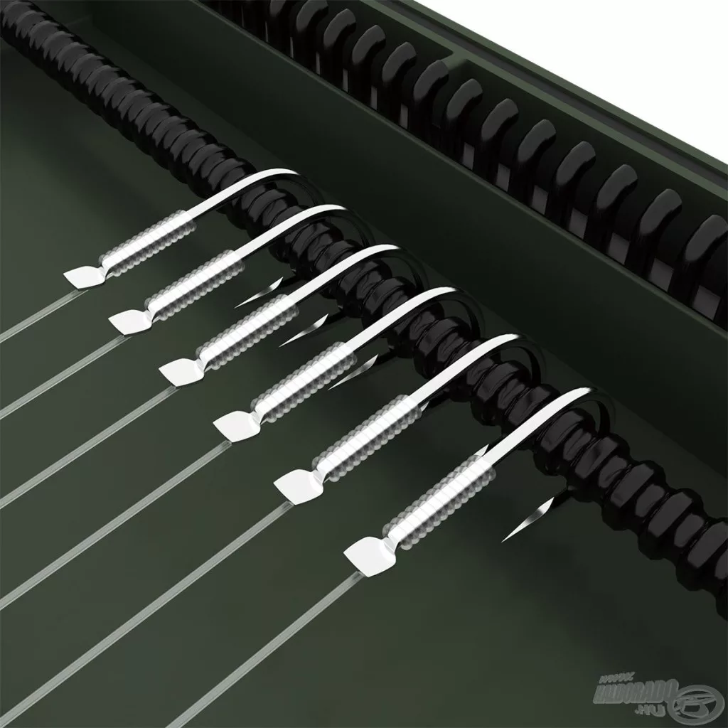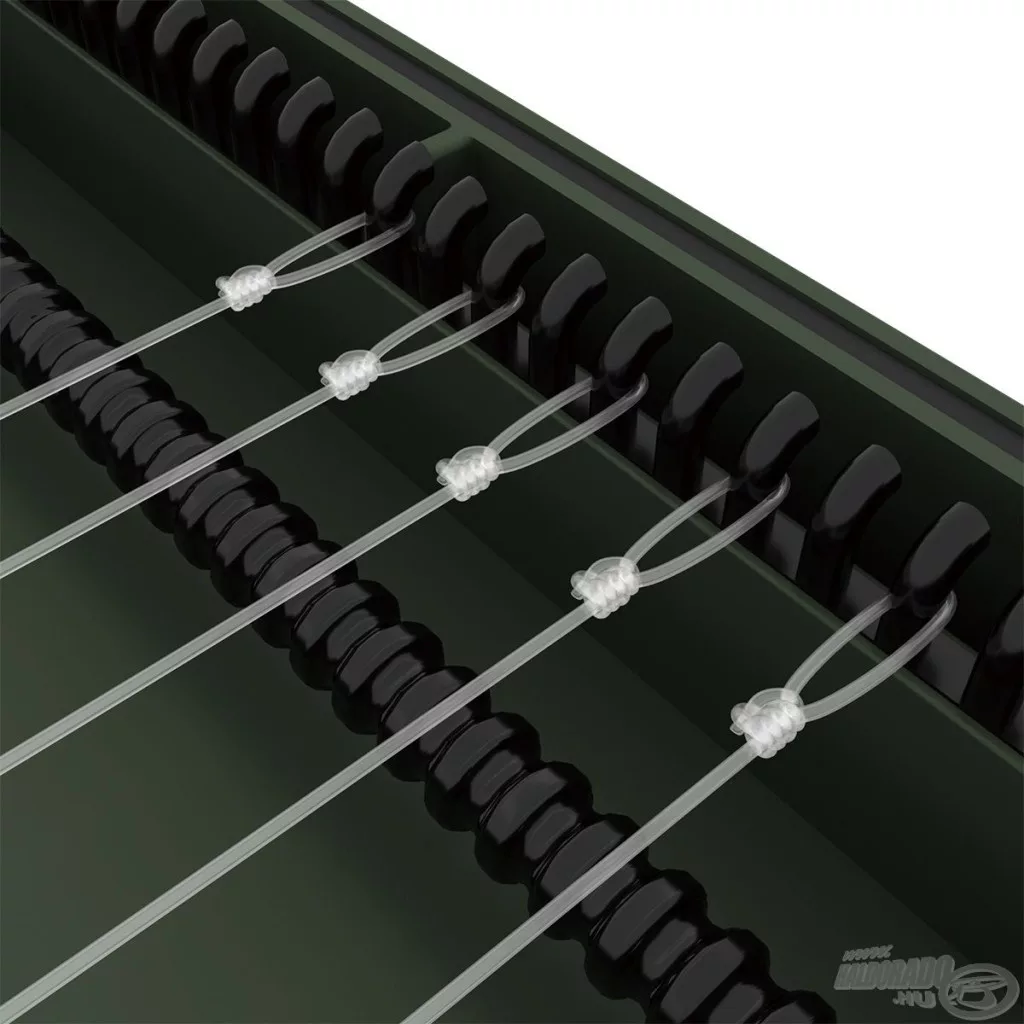 – L'autre côté est une section porte-bas de ligne recouverte de mousse EVA, parfaite pour le rangement organisé et sécurisé des bas de ligne déjà montés. Les bas de ligne peuvent être fixés à l'aide d'épingles fournies.