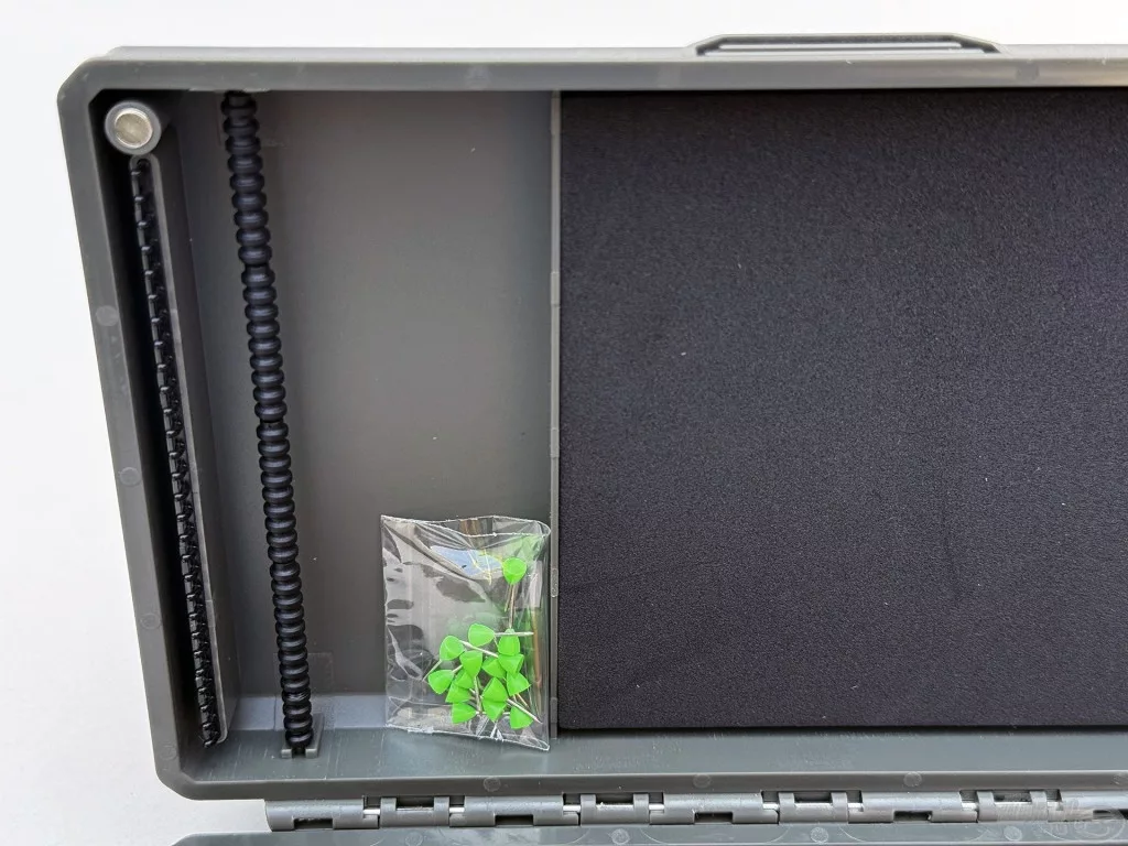 La surface extérieure de la Carp Box est munie d'une réglette en centimètres et en pouces, ce qui facilite la coupe ou la vérification précise des bas de ligne. Le couvercle vert confère un aspect élégant à la boîte, tandis que les couvercles transparents des compartiments permettent une organisation claire. Les 15 épingles fournies assurent la fixation des bas de ligne dans l'insert EVA.