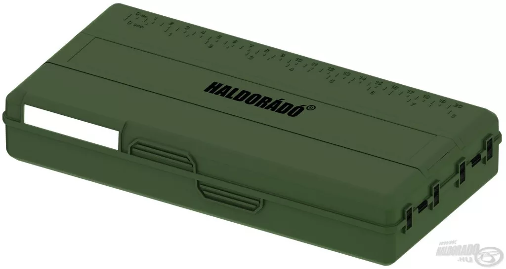 Le couvercle de la boîte est muni de règles intégrées en centimètres et en pouces, ce qui aide à attacher précisément les bas de ligne au bord de l'eau. Ce détail peut être particulièrement utile lors de compétitions de pêche ou lors de la préparation de montages précis.