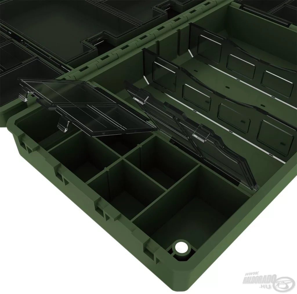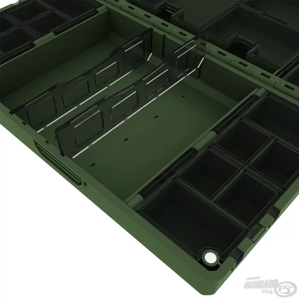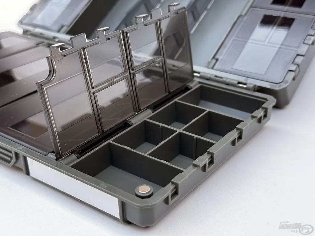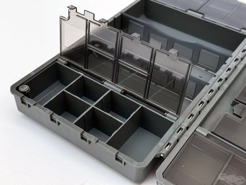 Une moitié de la boîte contient 27 compartiments individuels à ouverture séparée, idéaux pour le rangement sécurisé et transparent des petits accessoires – par exemple, émerillons, capuchons en caoutchouc, aligneurs ou stoppeurs. L'autre côté fonctionne comme un espace de rangement plus grand, partiellement ouvert, qui peut être personnalisé à l'aide de 2 séparateurs. C'est une solution idéale pour ranger des outils plus grands, comme des plombs, des paniers ou des petites boîtes d'accessoires.