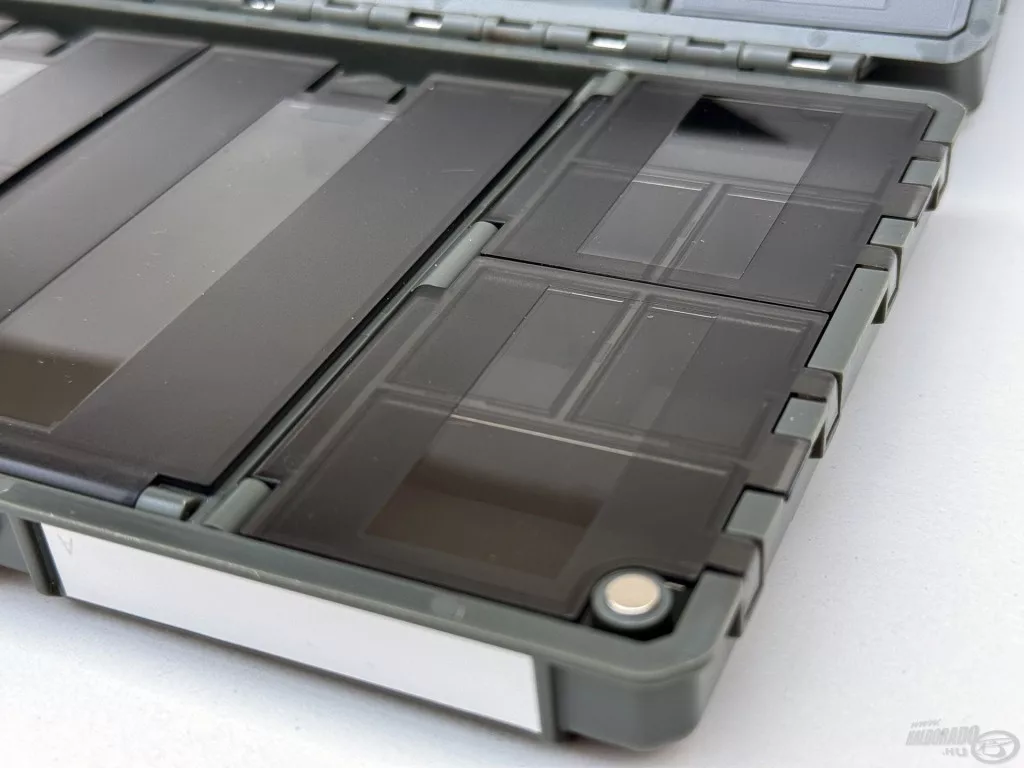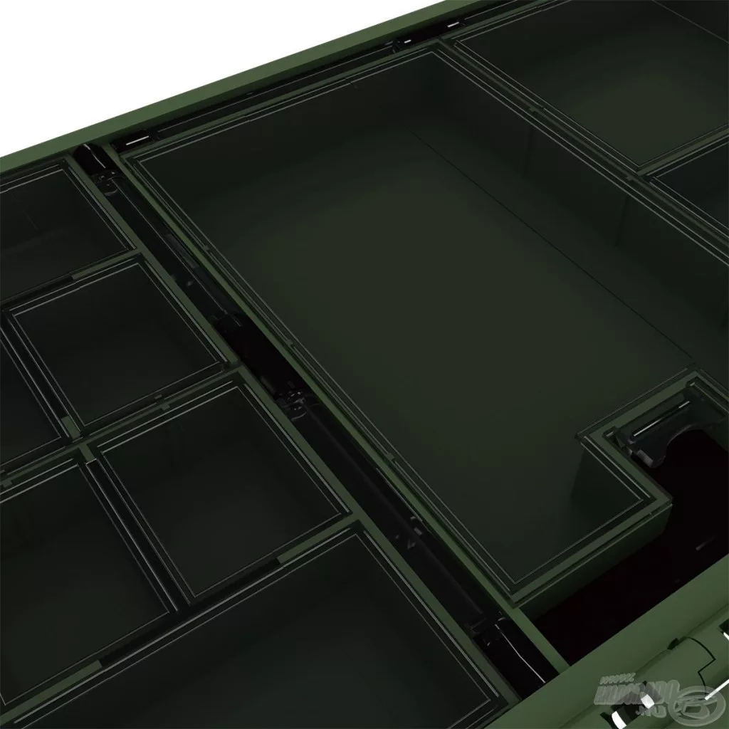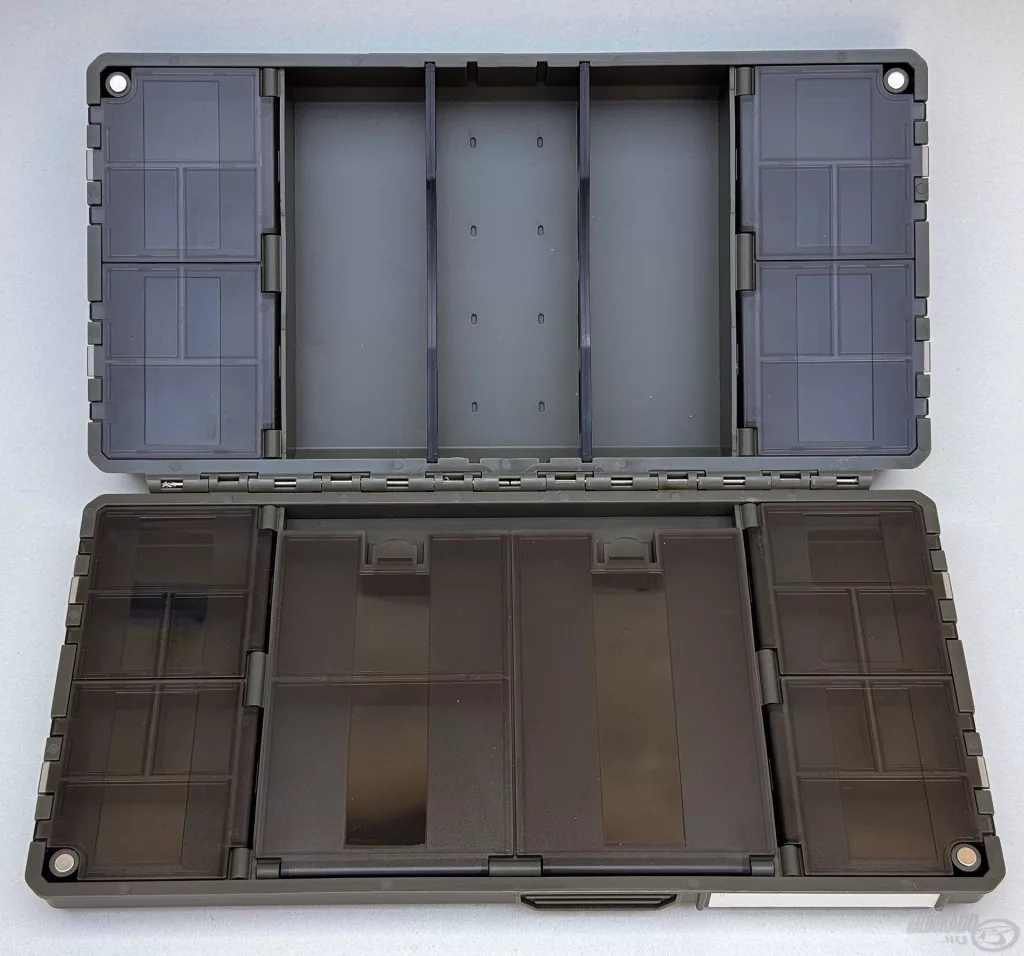 Une moitié de la boîte contient 27 compartiments individuels à ouverture séparée, idéaux pour le rangement sécurisé et transparent des petits accessoires – par exemple, émerillons, capuchons en caoutchouc, aligneurs ou stoppeurs. L'autre côté fonctionne comme un espace de rangement plus grand, partiellement ouvert, qui peut être personnalisé à l'aide de 2 séparateurs. C'est une solution idéale pour ranger des outils plus grands, comme des plombs, des paniers ou des petites boîtes d'accessoires.