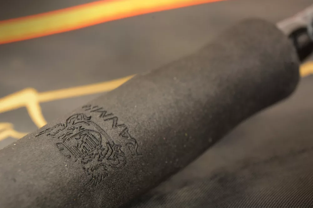 Sur son blank orné d'éléments dorés esthétiques, un porte-moulinet à visser par le haut, décoré de carbone, a été placé.
