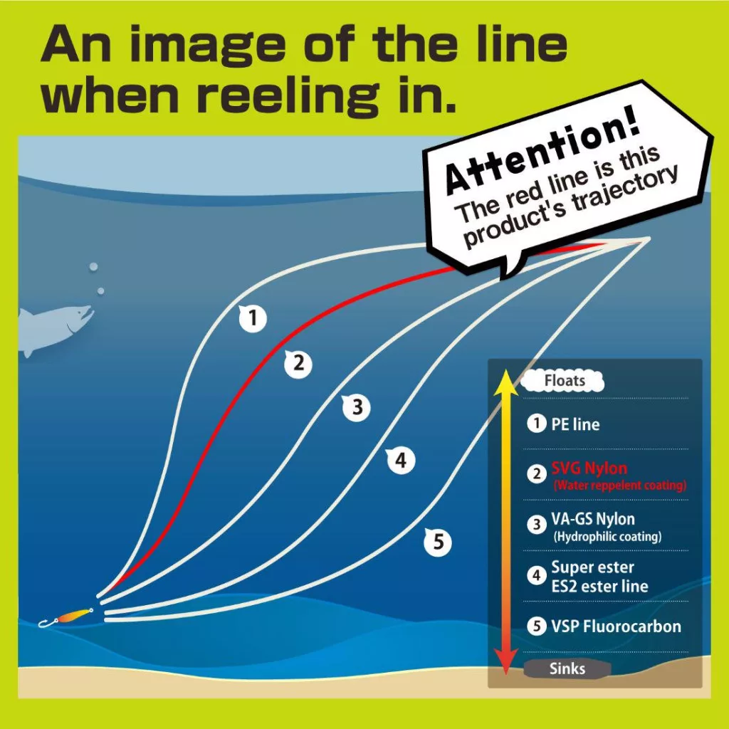 La couleur naturelle de la ligne se fond presque entièrement dans l'environnement aquatique, minimisant la visibilité de la ligne et augmentant les chances de prises. La technologie SVG représente le processus de fabrication premium de **Varivas**, qui résulte en une surface extrêmement lisse. Grâce à cela, le frottement de la ligne sur les anneaux est minimal, ce qui permet des lancers plus longs et plus précis, même avec les appâts les plus légers. De plus, la mémoire de la ligne est exceptionnellement faible, vous pouvez donc vous attendre à moins d'emmêlements.